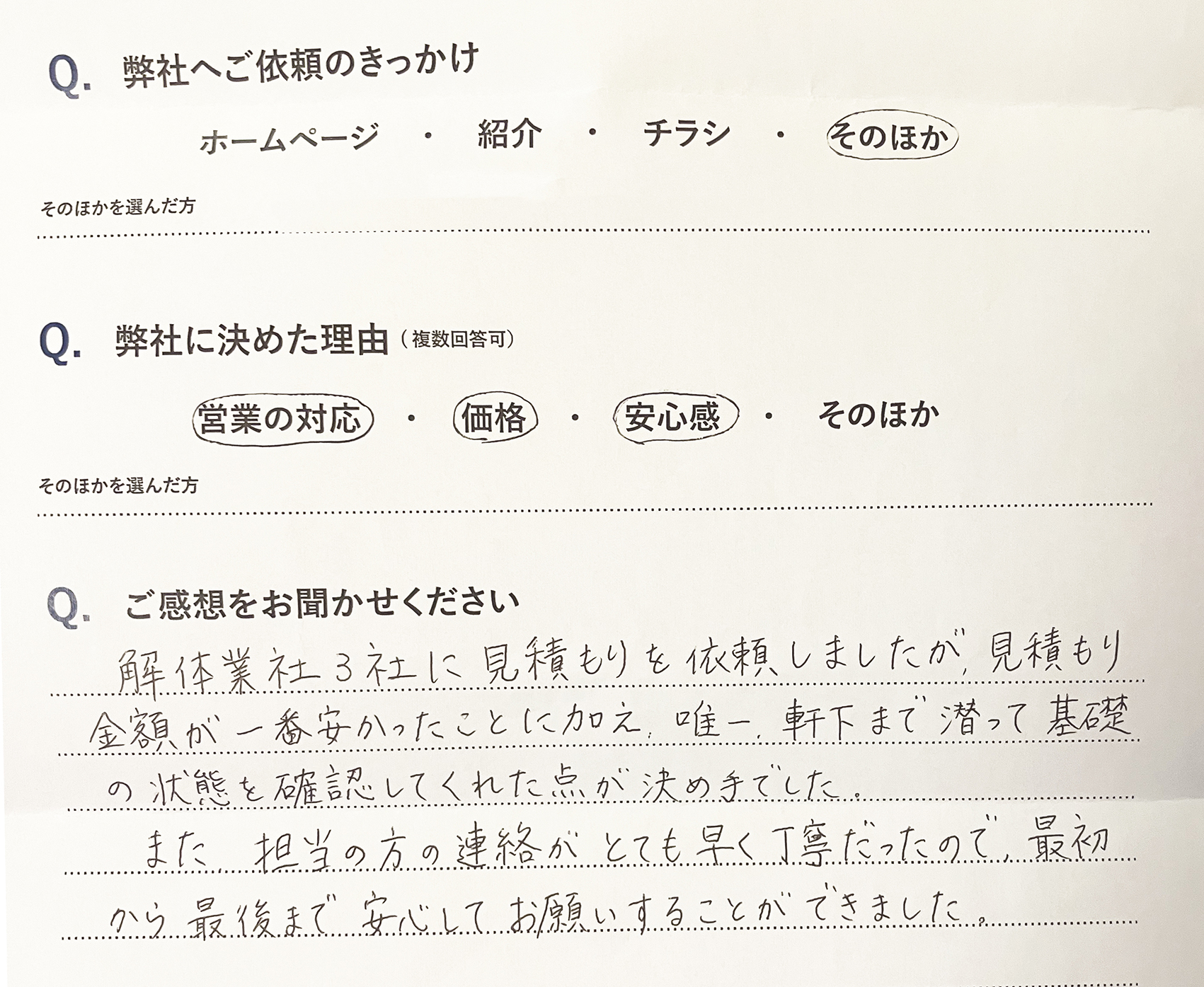 解体業者3社に見積りを依頼しましたが、見積り金額が一番安かったことに加え、唯一、軒下まで潜って基礎の状態を確認してくれた点が決め手でした。 また、担当の方の連絡がとても早く丁寧だったので、最初から最後まで安心してお願いすることができました。